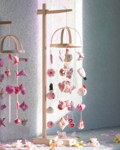 「葵桃」は、控えめな愛らしさと上品な仕上がりが魅力のつるし飾りです。特に中央にあしらわれた彩り鮮やかなつまみ細工の花飾りが目を引きます。このつまみ細工も、もも屋のつるし飾りの自慢の逸品。丁寧に仕立てられた繊細な手仕事は、一目で「特別」を感じさせてくれる存在感です。雛人形と一緒に飾れば、桃の節句をより華やかで印象深いものにしてくれます。