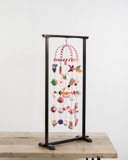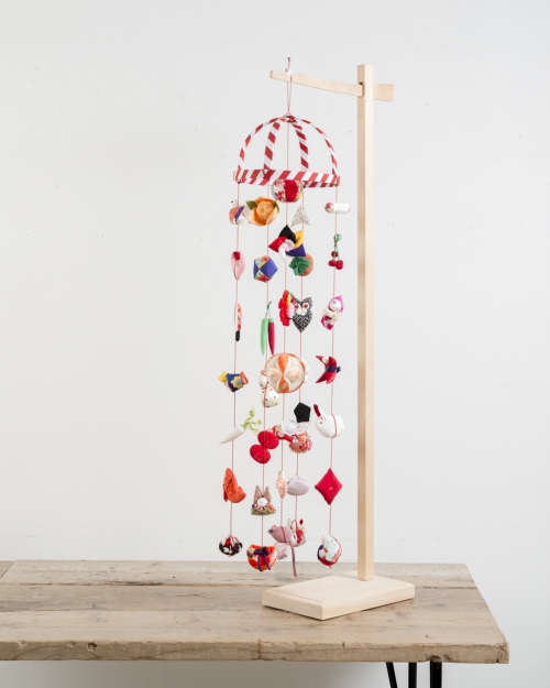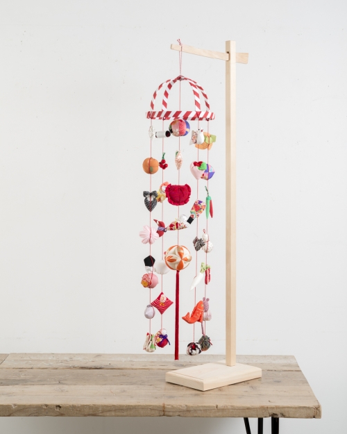 月シリーズは、もも屋が制作するつるし飾りのなかで、最も飾りが大きく豪華なつるし飾りです。生地の個性や色彩の調和、縫製のこまやかさ、優美ながらも迫力のある佇まいなど、このサイズだからこそ味わえる魅力に溢れています。大ぶりな飾りのひとつひとつに、凛として生き生きとした存在感があり、格調高い雅やかな日本の美と、ほっとするようなかわいらしさが同居する、もも屋自慢の逸品です。五段・七段の大型の雛壇と合わせて飾っても、バランスの取れるサイズとなっています。伊豆稲取の伝統的なつるし飾りに即した、正統なデザインのつるし飾りです。飾りの長さが異なる『月』と『錦月』の二タイプのご用意があります。